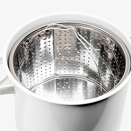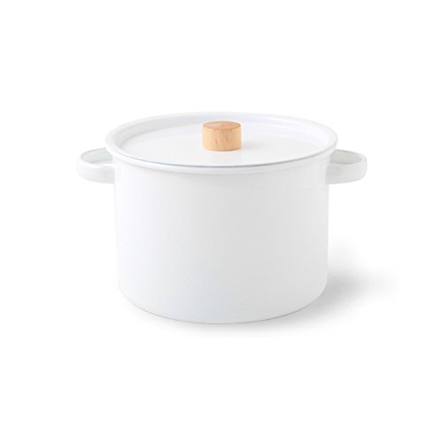 The Kaico Cookware Collection is an elegant assortment of white enamelware with turned maple accents. Designed to be durable enough to last for a lifetime, the Kaico collection is an enduring classic that blends function and thoughtful Japanese design. This two-handled Pasta Pot Set is designed with a convenient lid with a maple handle, making it faster to boil water. Thermal efficient, the simple enamel pot heats quickly on a stovetop and is easy to use and clean. The pot includes a stainless steel strainer insert for draining pasta. The pot is neutral enough to coordinate with an existing collection of pots and pans, and can also be used with other Kaico enamelware products to give a cohesive, minimalist look to kitchen cookware.
