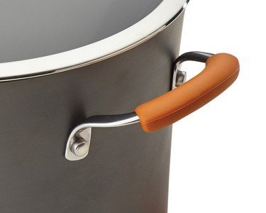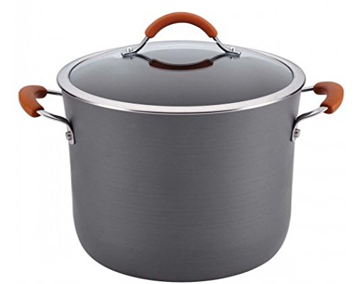 You’ll never need another stockpot with the Rachael Ray Cucina Hard-Anodized Nonstick 10-qt. Gray with Cranberry Red Handles Covered Stockpot. Featuring hard-anodized aluminum construction to quickly and evenly heat generous batches of all your favorite soup recipes, this pot boasts a PFOA-free nonstick coating for easy cleanup. Meanwhile, the silicone-covered stainless steel handles are dual riveted for added strength, so you can move this pot from the stovetop to the 400°F oven to the table safely and easily.