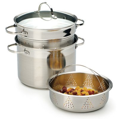 If ever there was an all-in-one piece of cookware to own, this is the one we would suggest. Appropriately called ???multi cooker,??? the 4-piece set includes an 8-quart Stockpot, pasta insert, steaming basket and a tempered glass lid. Like the professionals, you can simmer your homemade stocks and soups, boil and drain delicate pastas and gently steam your vegetables. The slim, arched handles promote easier lifting.