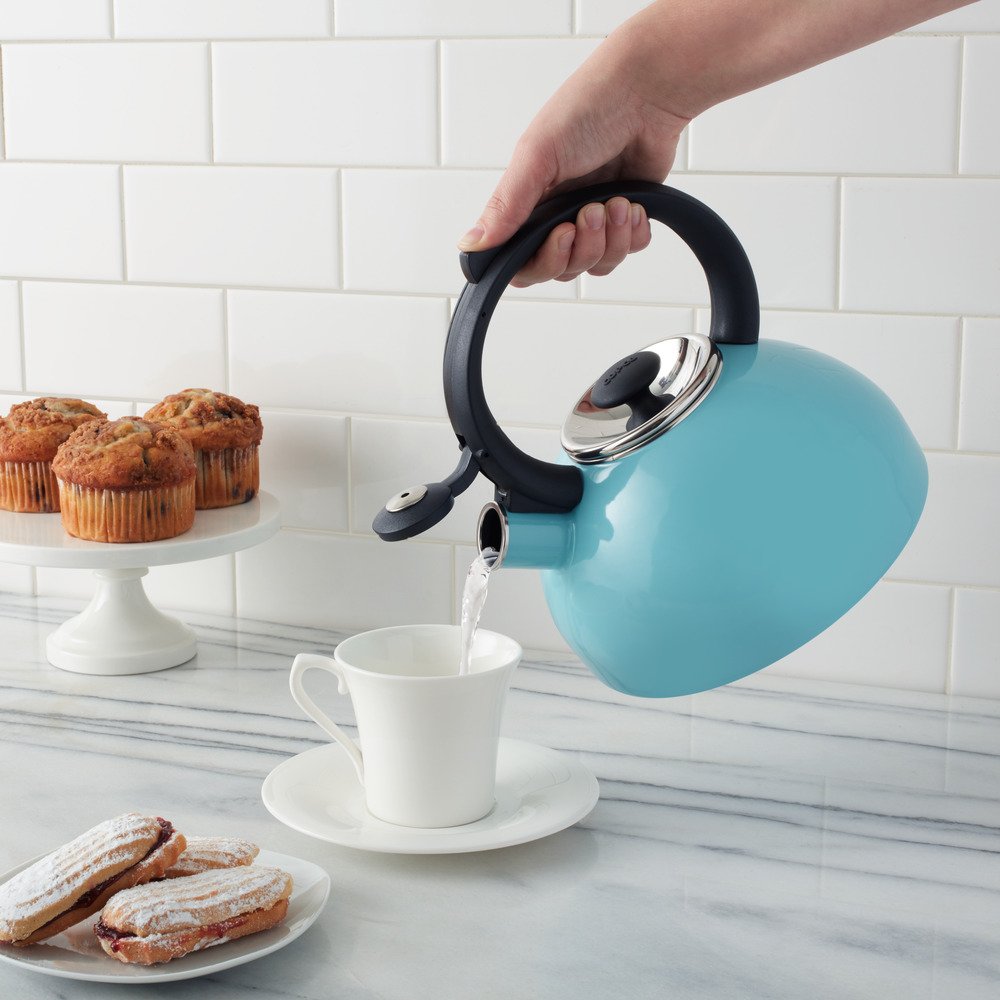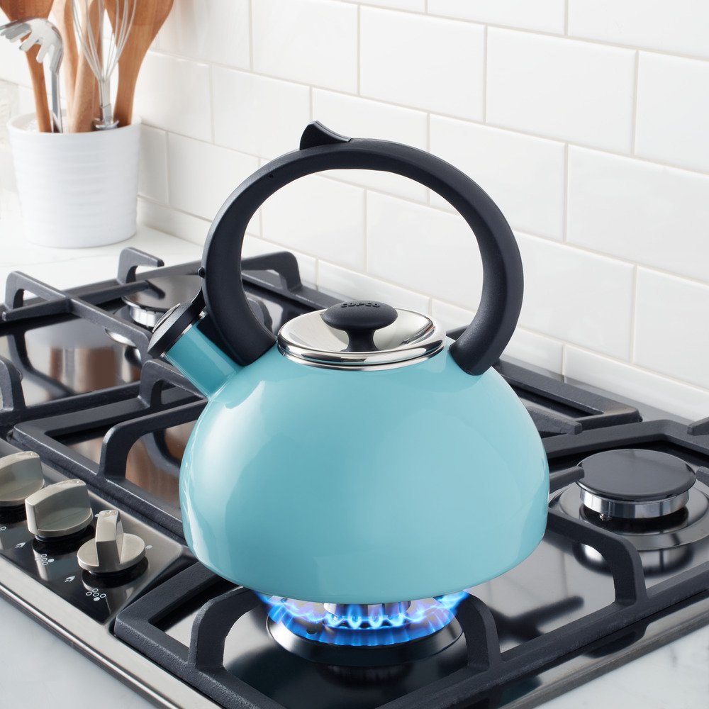 This Copco Bellini Tea Kettle stands out in any kitchen with its attractive Aqua Sky enamel finish. Crafted from carbon steel with a porcelain-enamel coated exterior, this kettle is scratch- and stain-resistant. A pleasant, audible whistle will sound to alert you when the water has reached boil point and is temperature-ready for tea time. A full-loop, heat-resistant Phenolic handle with a trigger mechanism that can be operated with one hand to lift the whistle for safe and easy pouring; using a potholder is recommended to protect hands if water has just reached boil. With an everyday 2.27-quart (2.1 L) capacity, this stovetop tea kettle pot will make about 9 cups of hot water for delicious tea in minutes. With a flat bottom, this kettle is compatible with gas, electric, glass and induction stove tops and features an tight-fitting stainless steel lid to prevent liquid spills and keep water warm for your next cup. Hand wash only.
