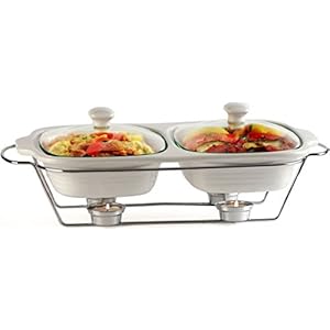 Circleware Ceramic Double Chafer Buffet Food Server Warmer Tray with Handles Glass Lid & Chrome Metal Serving Stand, 1…